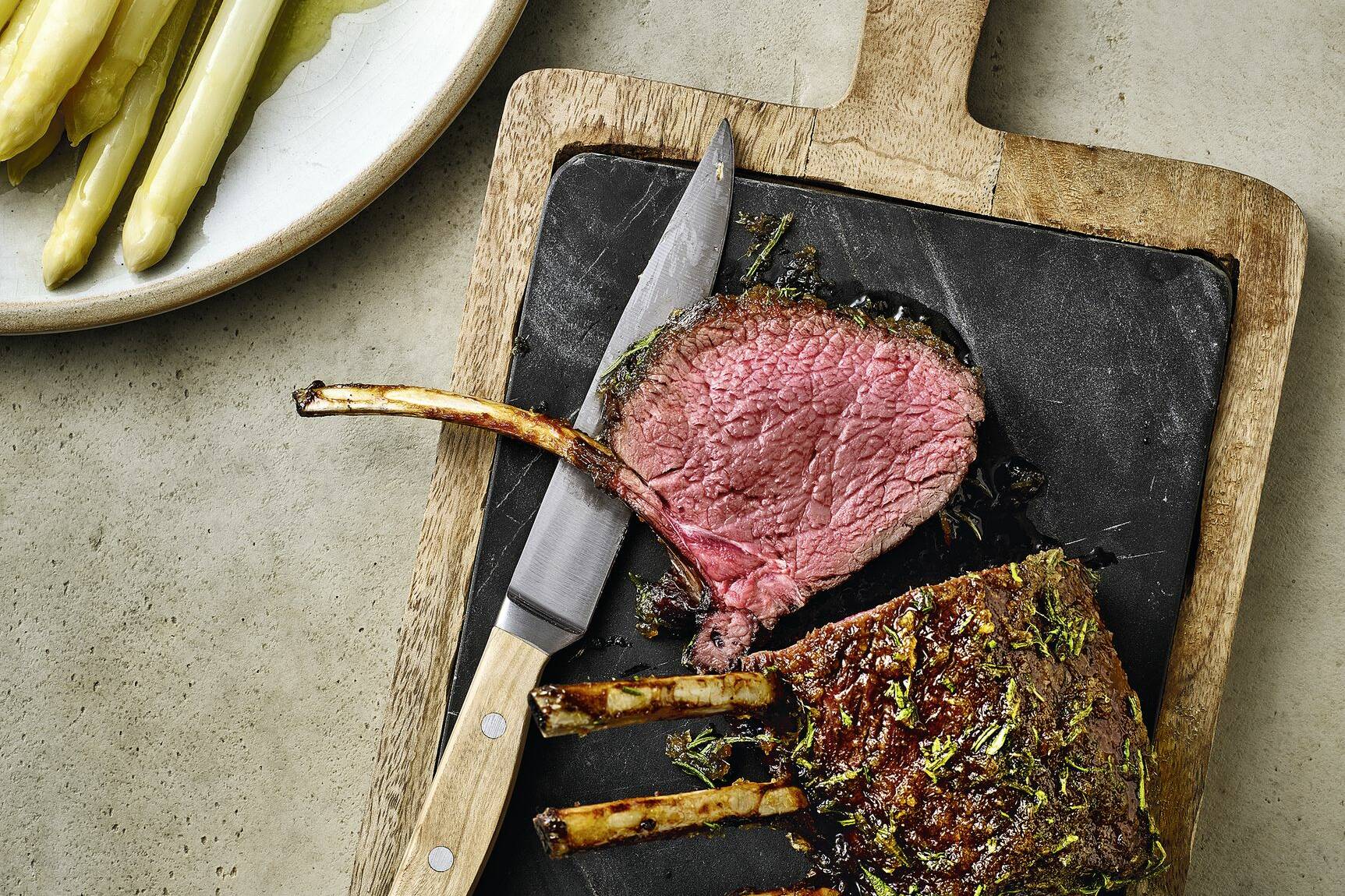 Damwild-Karree mit Ingwer-Kräuter-Kruste und Spargel